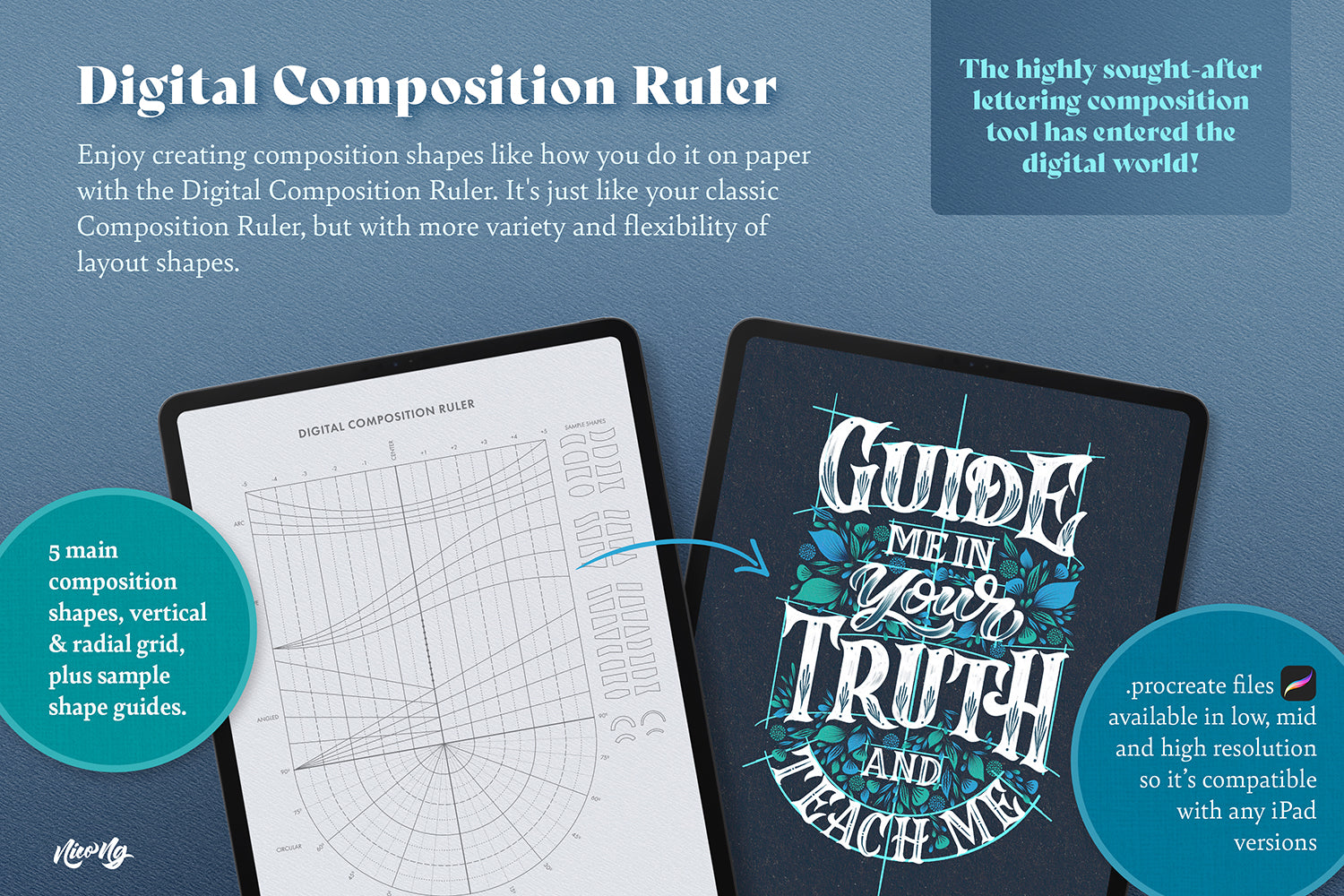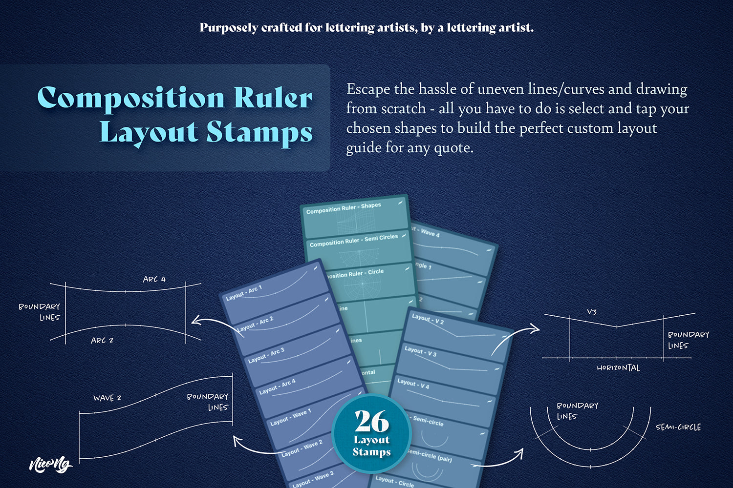 Get your Composition Ruler Design Kit now and start creating better lettering on Procreate, easier! Learn how to use the Composition Ruler Design Kit here.
