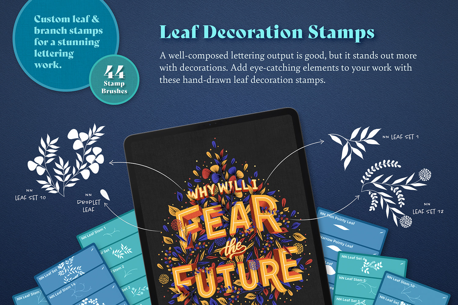 - Decorate your lettering with hand-drawn leaf illustrations with the Leaf Decoration Stamps.