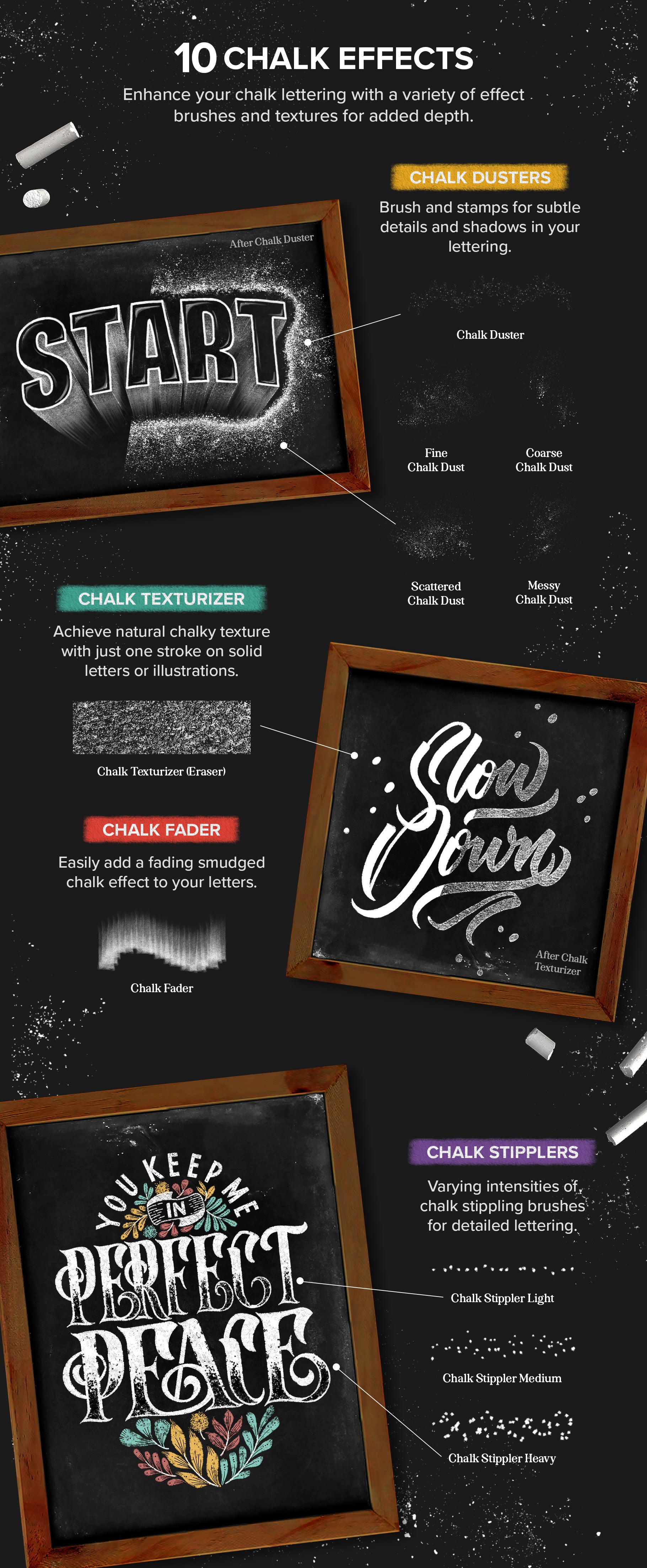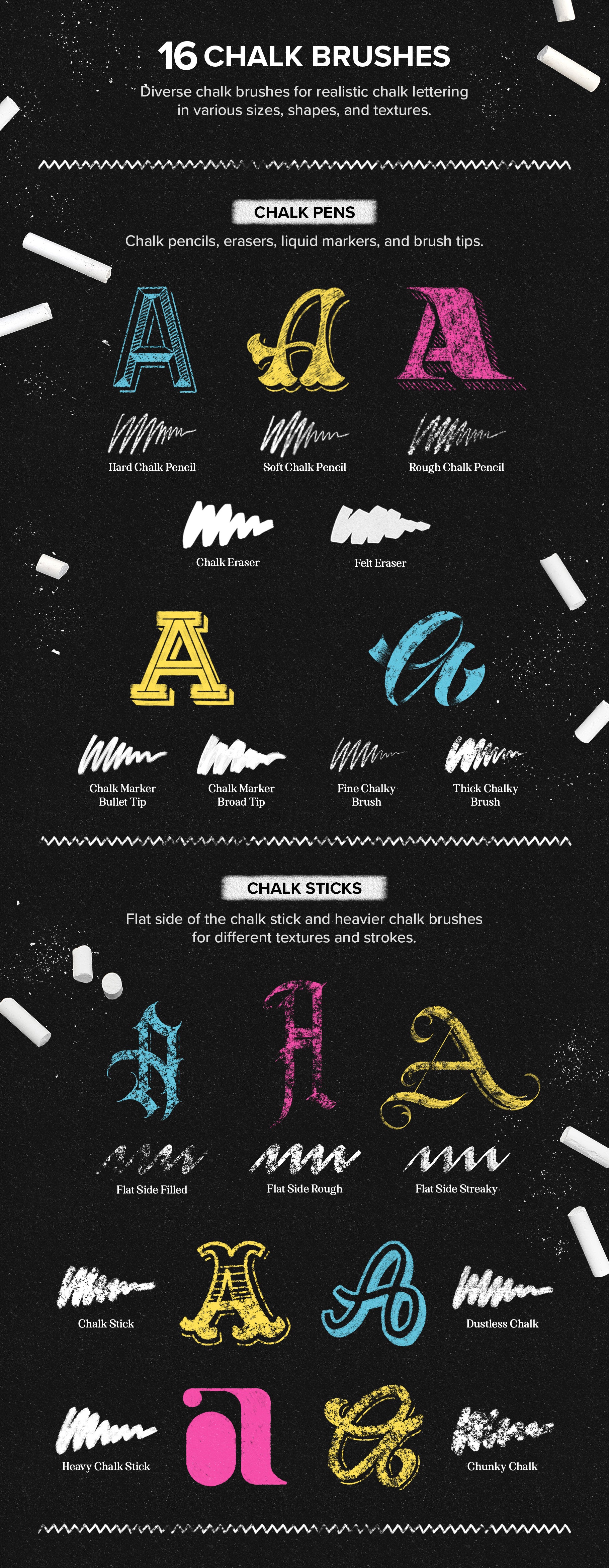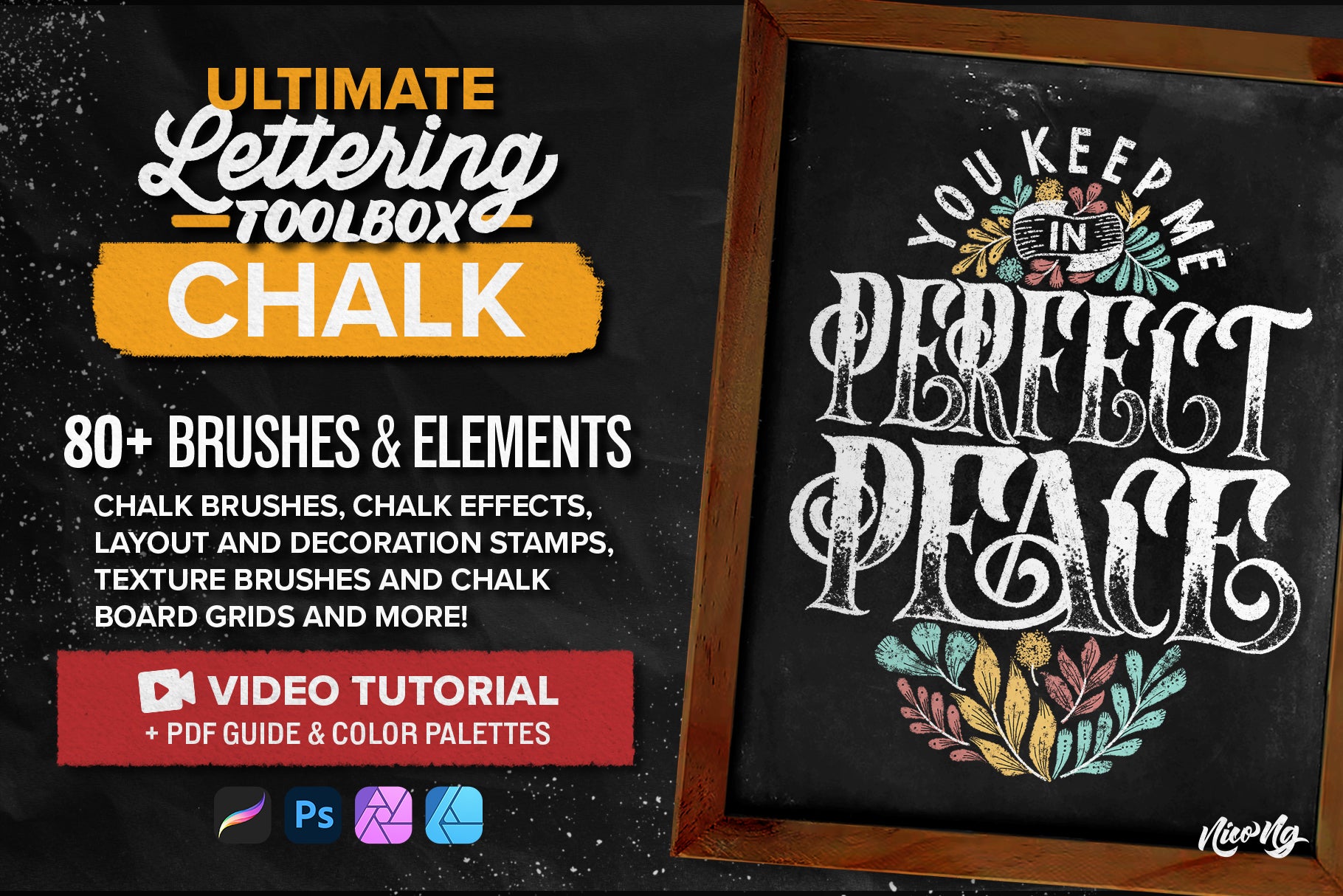 In this incredible collection, you’ll find 82 Chalk Lettering brushes, effects, templates, and textures. It's a part of the Ultimate Lettering Toolbox, alongside five other packs. Crafting this comprehensive toolbox took 8 months, with a commitment to creating genuinely useful brushes and elements. We enlisted hobbyists and professionals to test each pack, and their enthusiastic response affirmed the completeness and usefulness of this brush set.