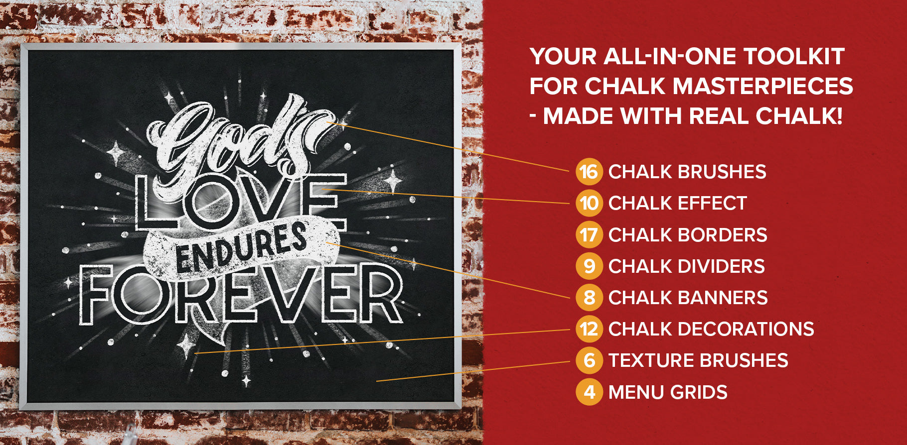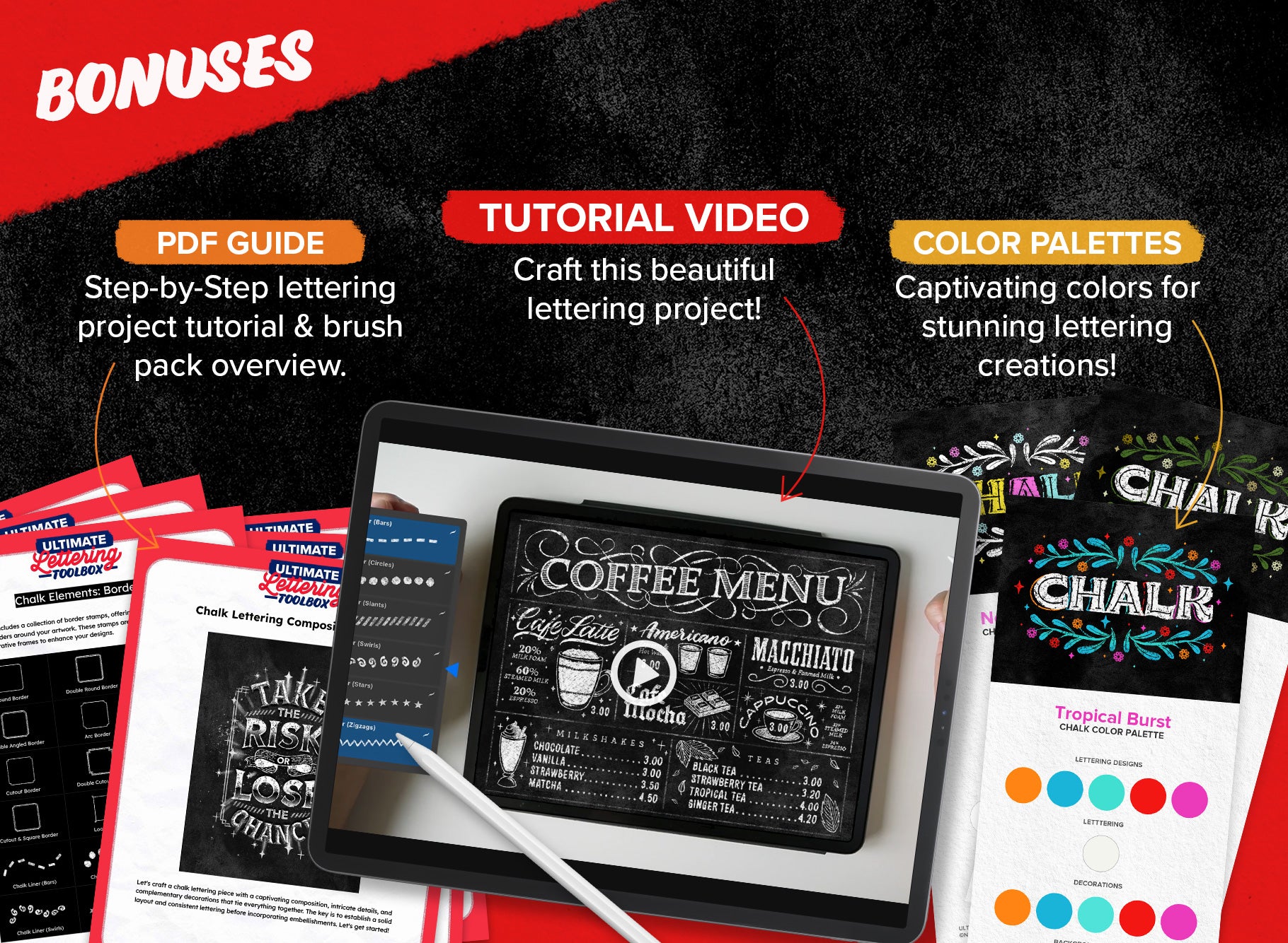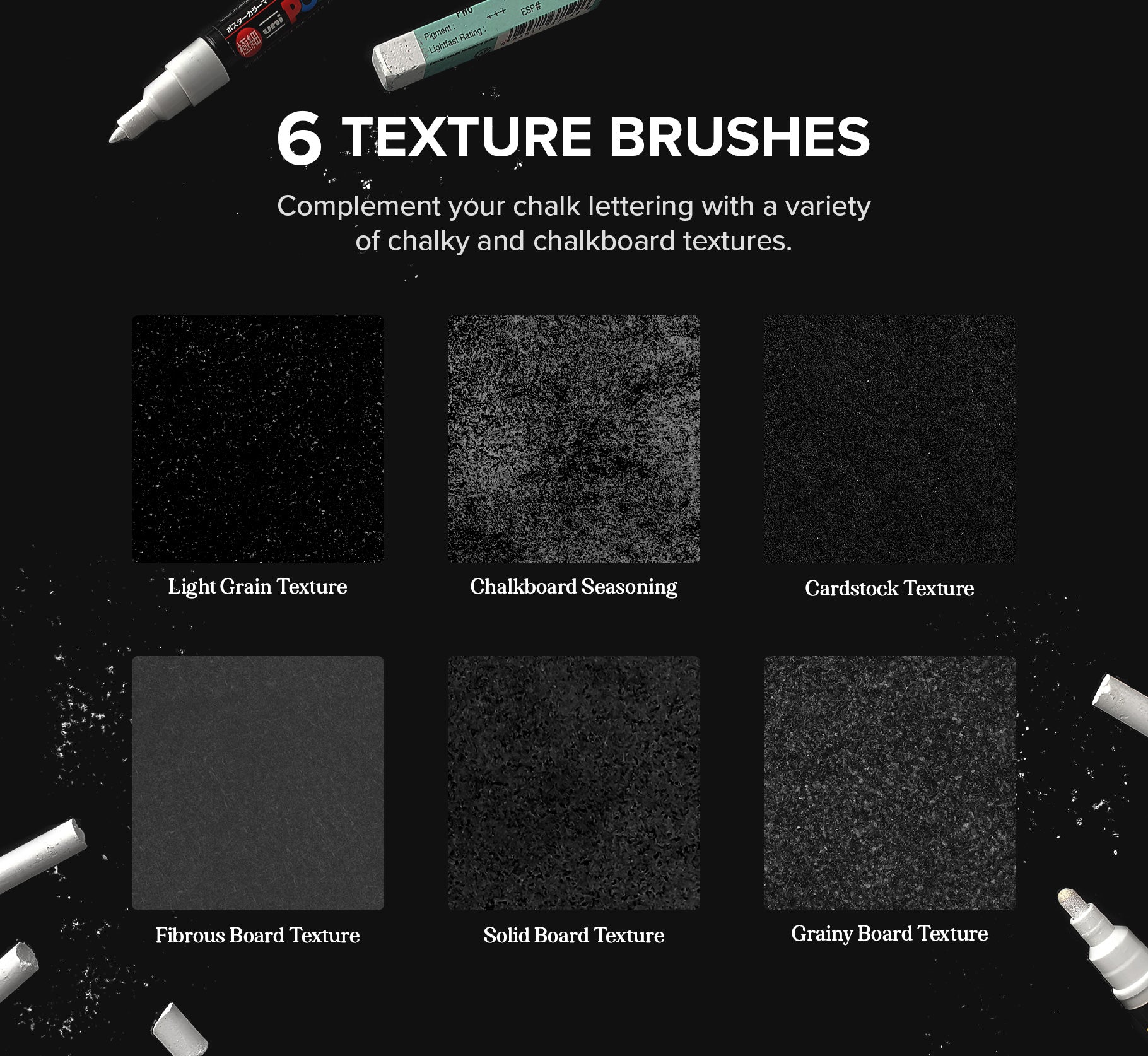 In this incredible collection, you’ll find 82 Chalk Lettering brushes, effects, templates, and textures. It's a part of the Ultimate Lettering Toolbox, alongside five other packs. Crafting this comprehensive toolbox took 8 months, with a commitment to creating genuinely useful brushes and elements. We enlisted hobbyists and professionals to test each pack, and their enthusiastic response affirmed the completeness and usefulness of this brush set.