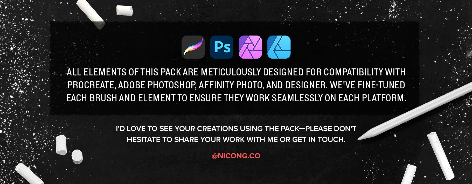 Whether you work with Procreate, Photoshop, Affinity Photo, or Designer, this pack is designed to enhance your creative process.