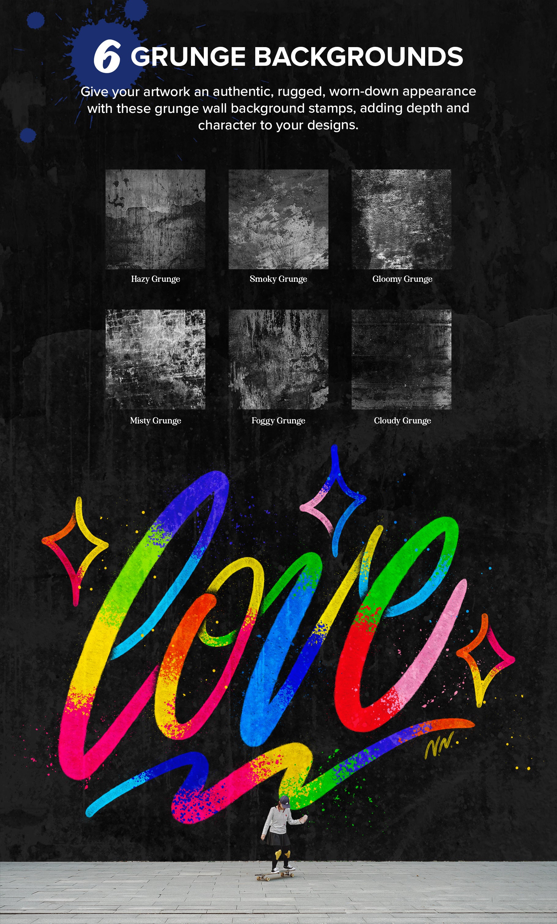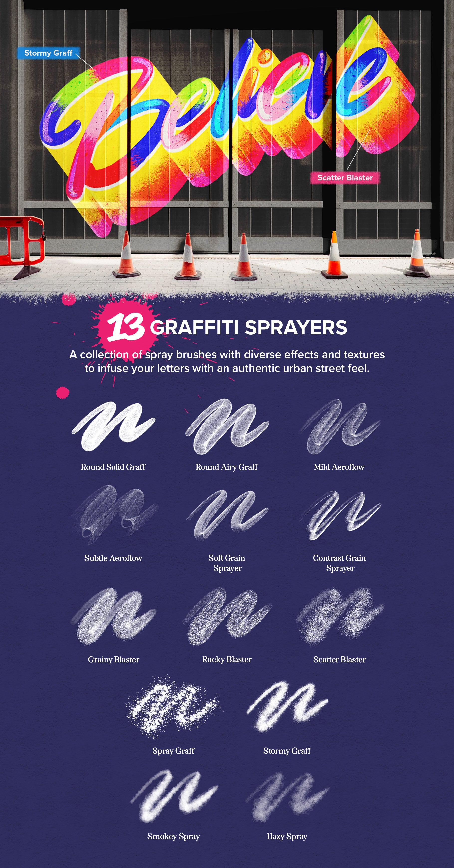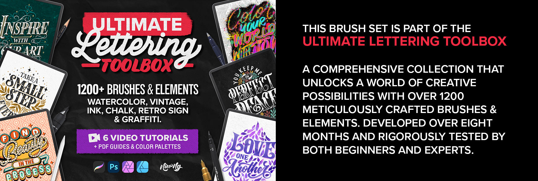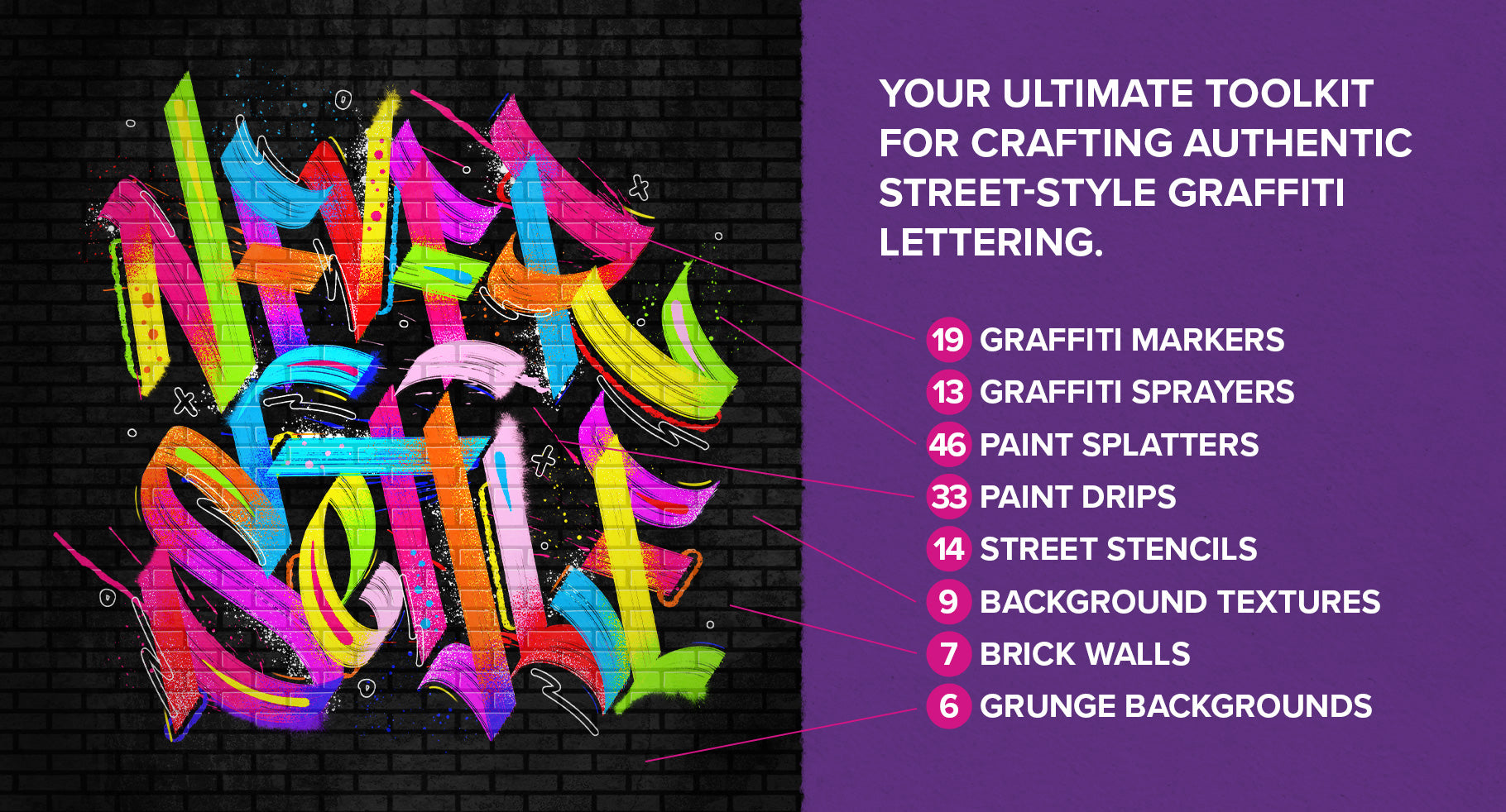 The dynamic pack includes 147 Graffiti Lettering brushes, effects, templates, and textures, and it's a part of the Ultimate Lettering Toolbox, alongside five other packs. Crafting this comprehensive toolbox took 8 months, with a commitment to creating genuinely useful brushes and elements. We enlisted hobbyists and professionals to test each pack, and their enthusiastic response affirmed the completeness and usefulness of this brush set.