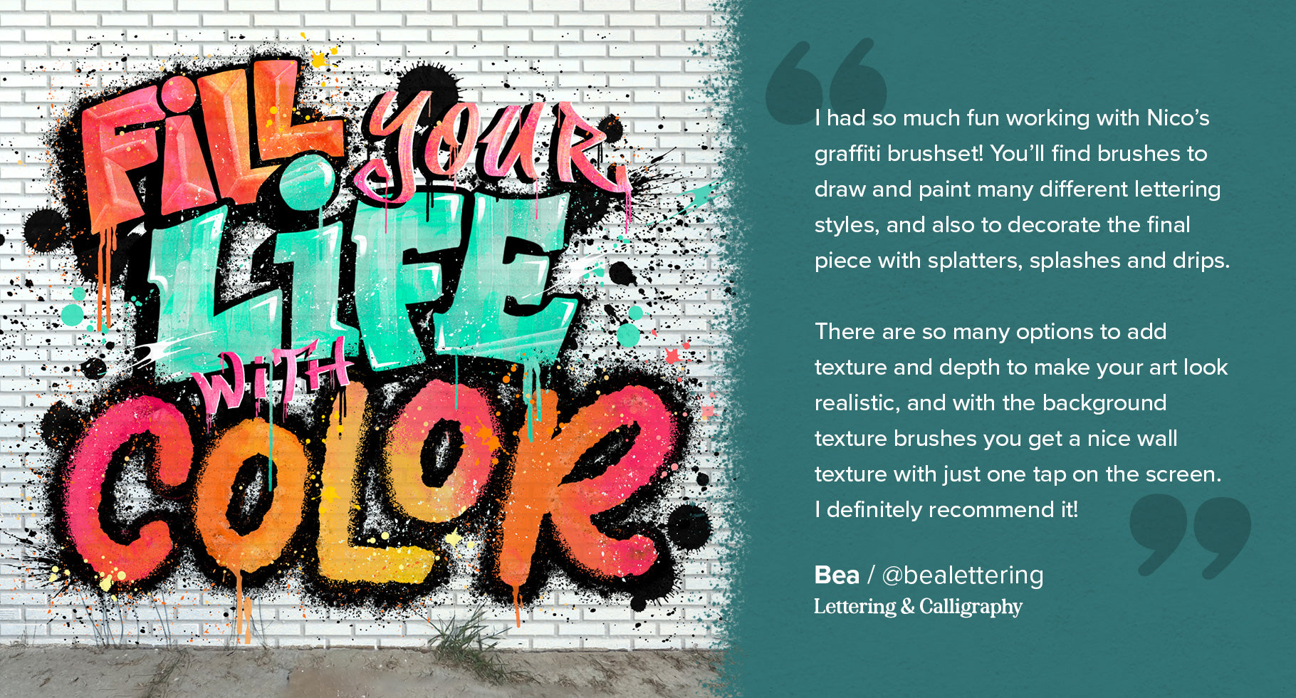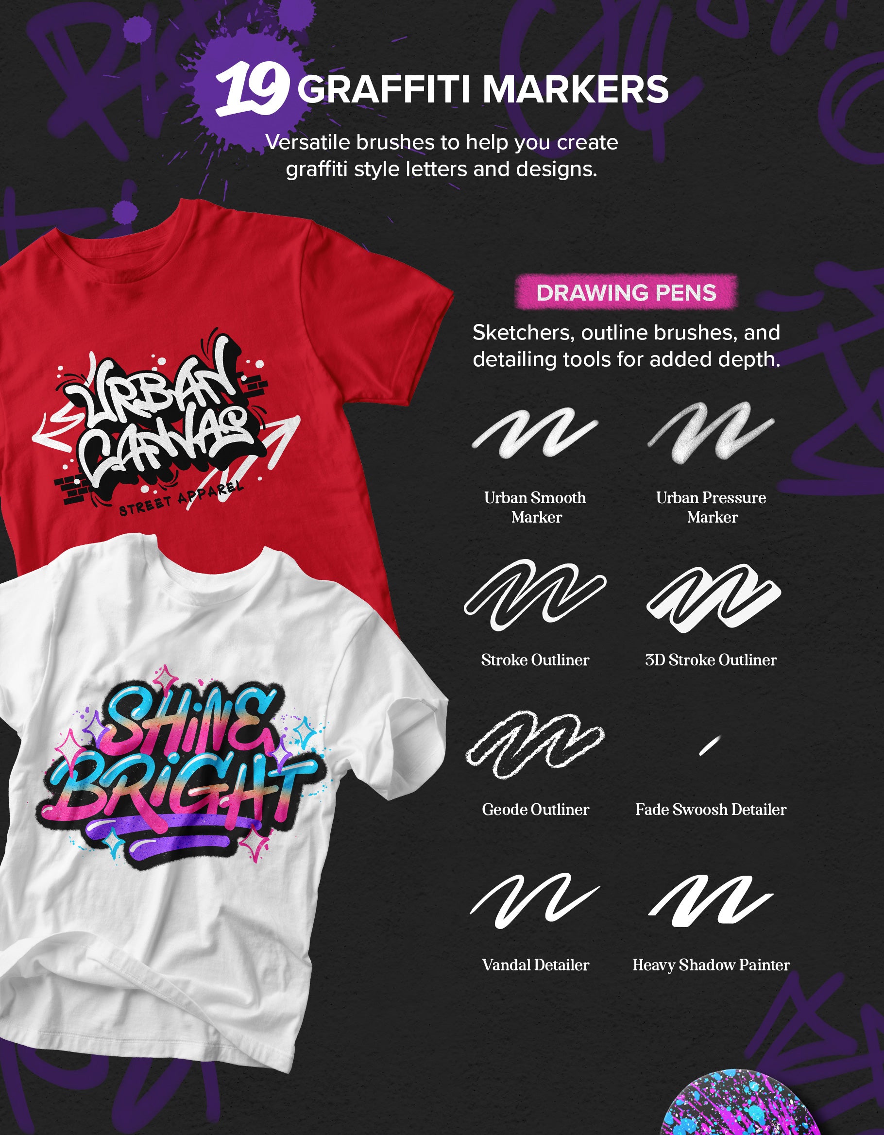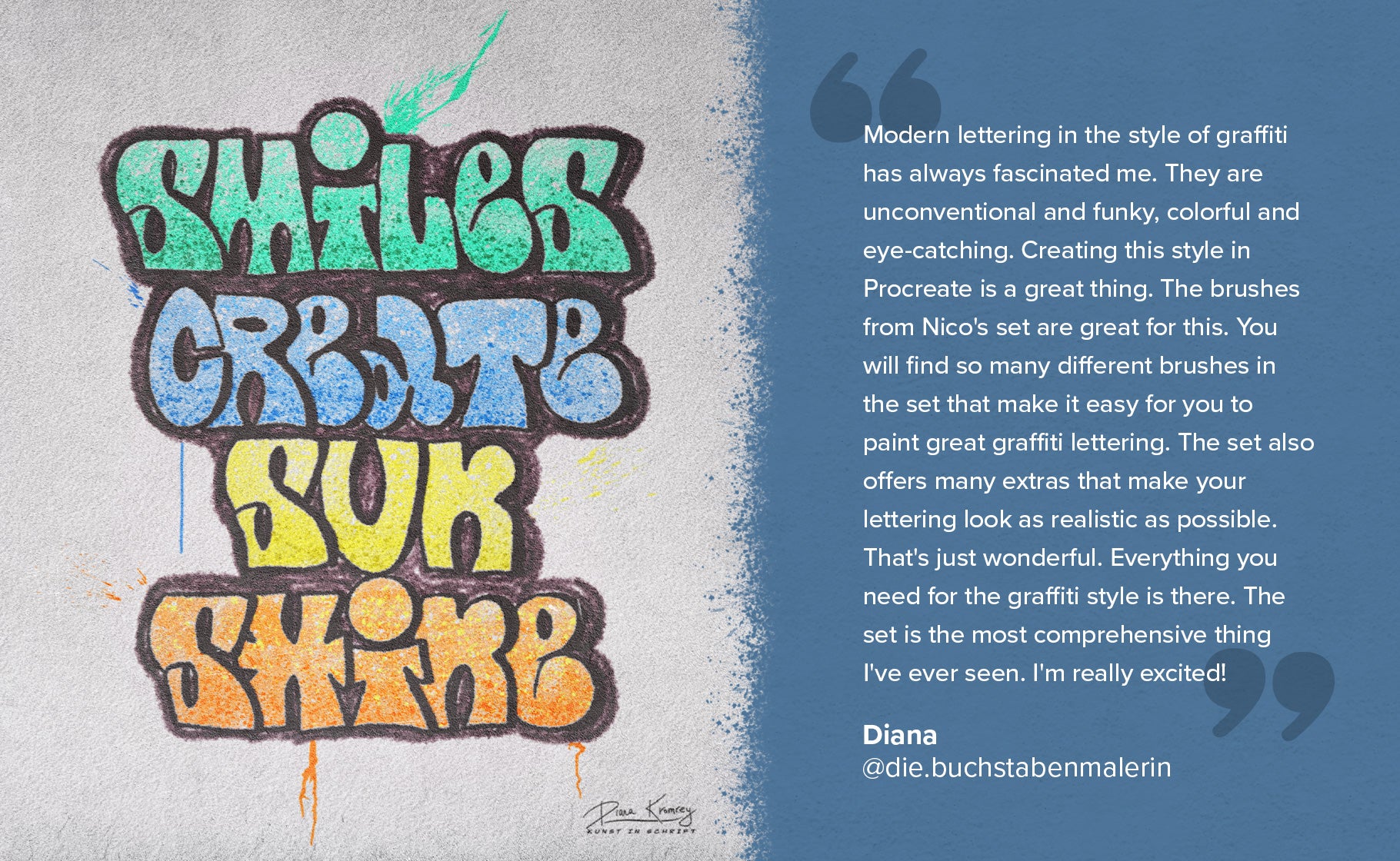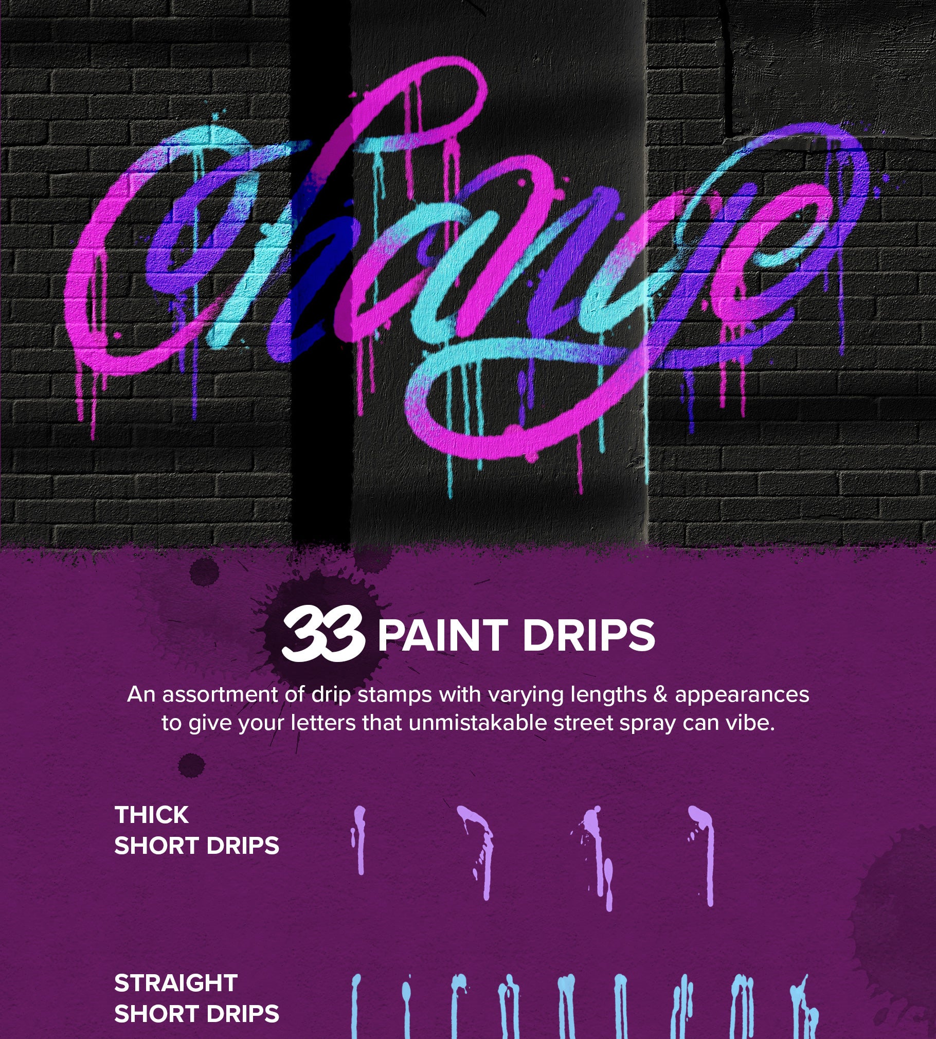 The dynamic pack includes 147 Graffiti Lettering brushes, effects, templates, and textures, and it's a part of the Ultimate Lettering Toolbox, alongside five other packs. Crafting this comprehensive toolbox took 8 months, with a commitment to creating genuinely useful brushes and elements. We enlisted hobbyists and professionals to test each pack, and their enthusiastic response affirmed the completeness and usefulness of this brush set.