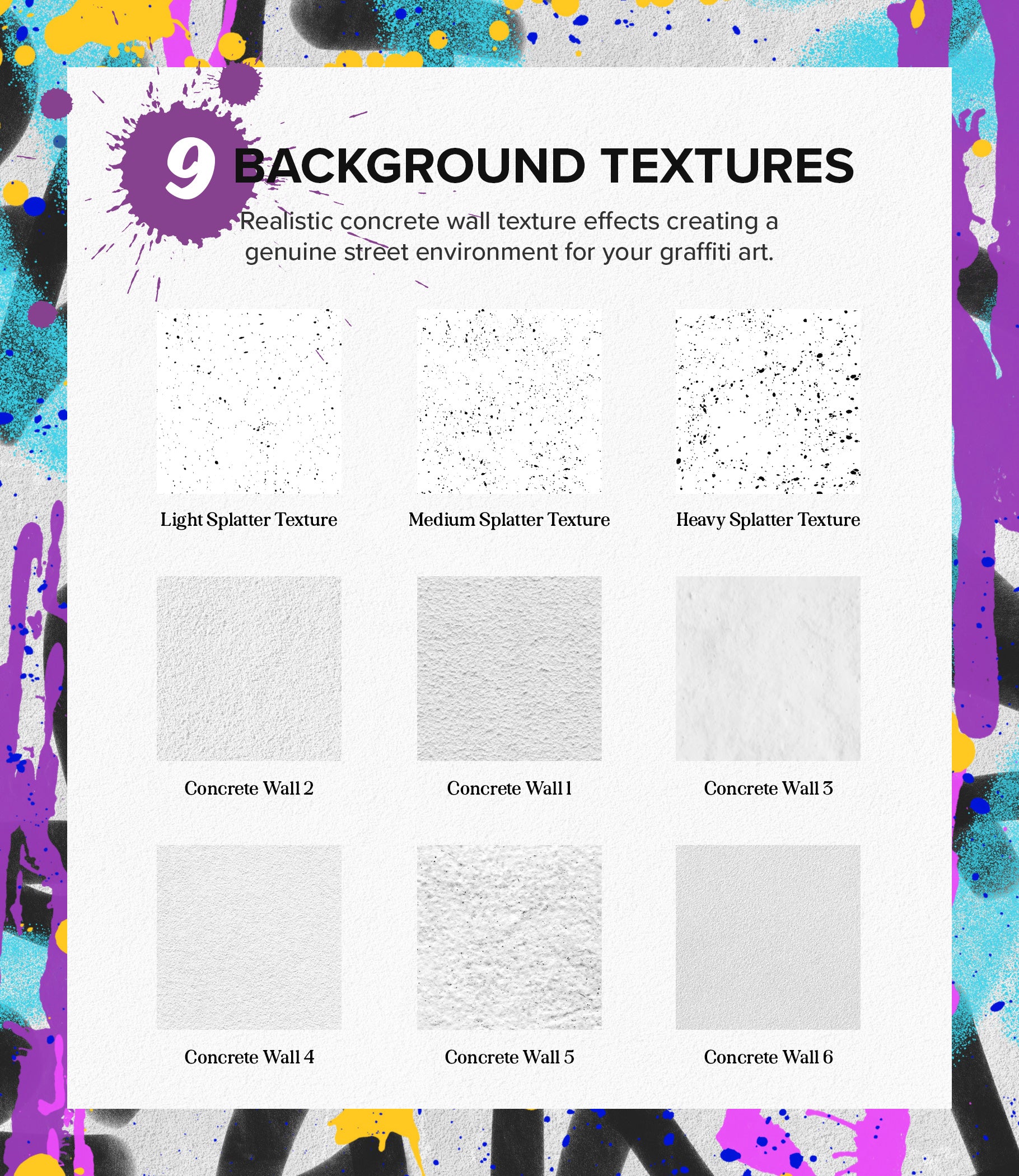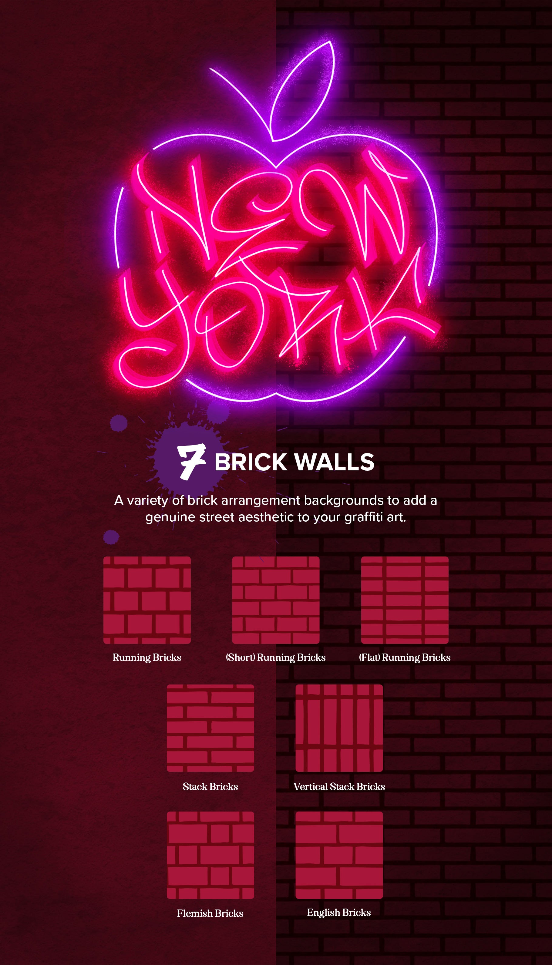 In this dynamic collection, discover a variety of textured markers, spray can effects, ink drips, splatters, realistic concrete wall textures, brick patterns, and grunge effects. These elements enable you to create authentic graffiti lettering and street art with spray textures, ink splatters, and drips that leave a strong impression.