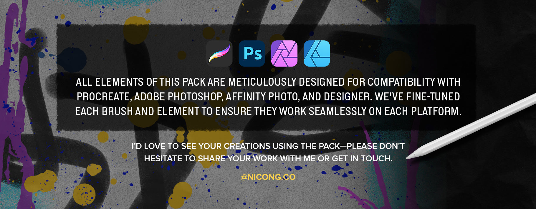 Whether you work with Procreate, Photoshop, Affinity Photo, or Designer, this pack is designed to elevate your creative process and help you achieve authentic graffiti artistry.