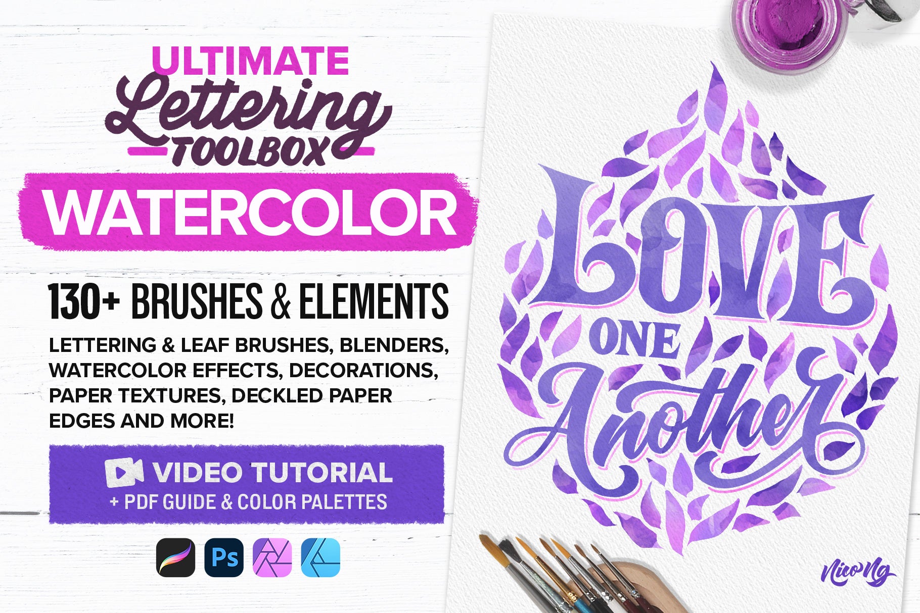 The Watercolor Lettering Pack features a remarkable selection of 132 Watercolor Lettering brushes, effects, templates, and textures. It's a part of the Ultimate Lettering Toolbox, alongside five other packs. Crafting this comprehensive toolbox took eight months of dedicated work, with a focus on creating genuinely useful brushes and elements. We engaged both hobbyists and professionals to test each pack, and their enthusiastic response affirmed the completeness and usefulness of this brush set.