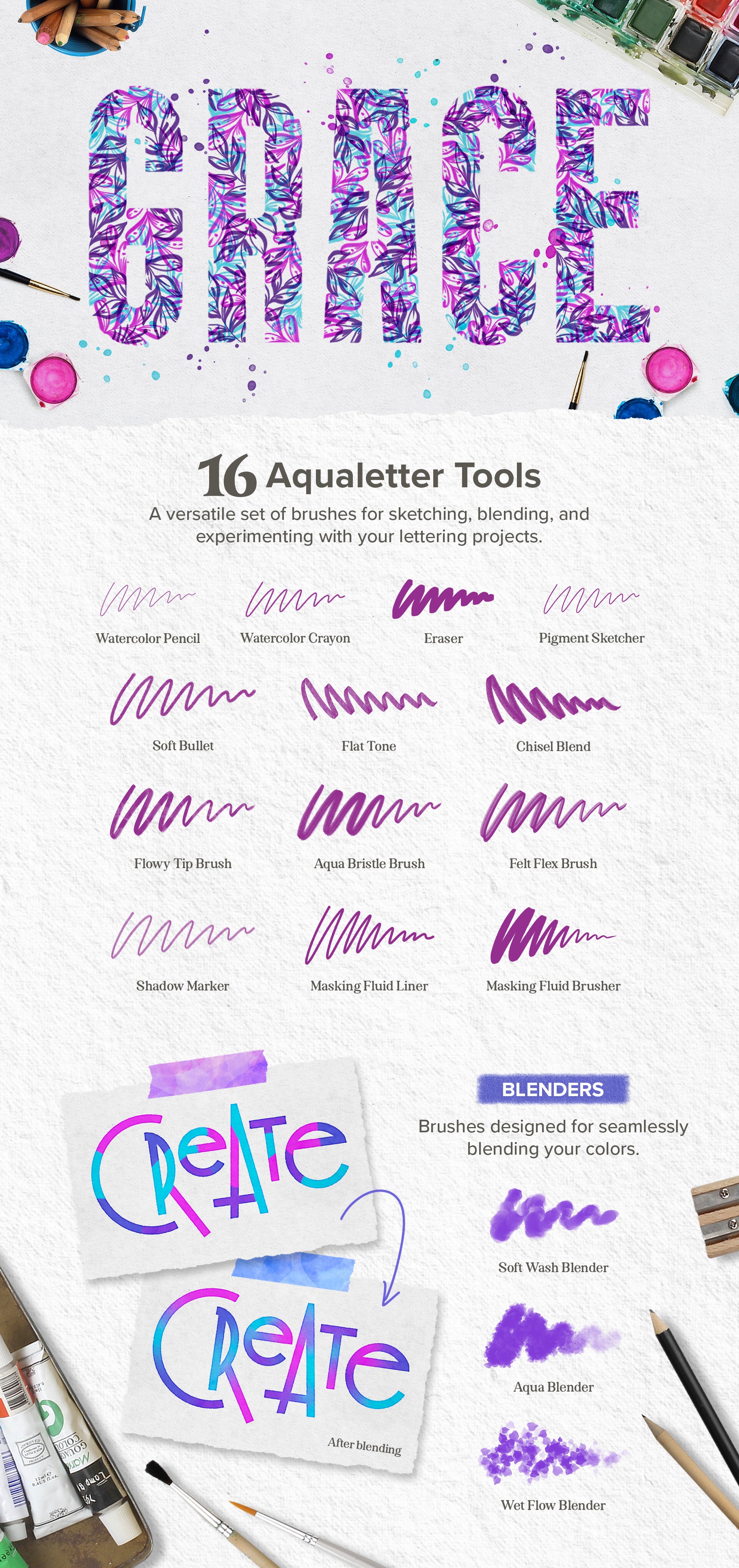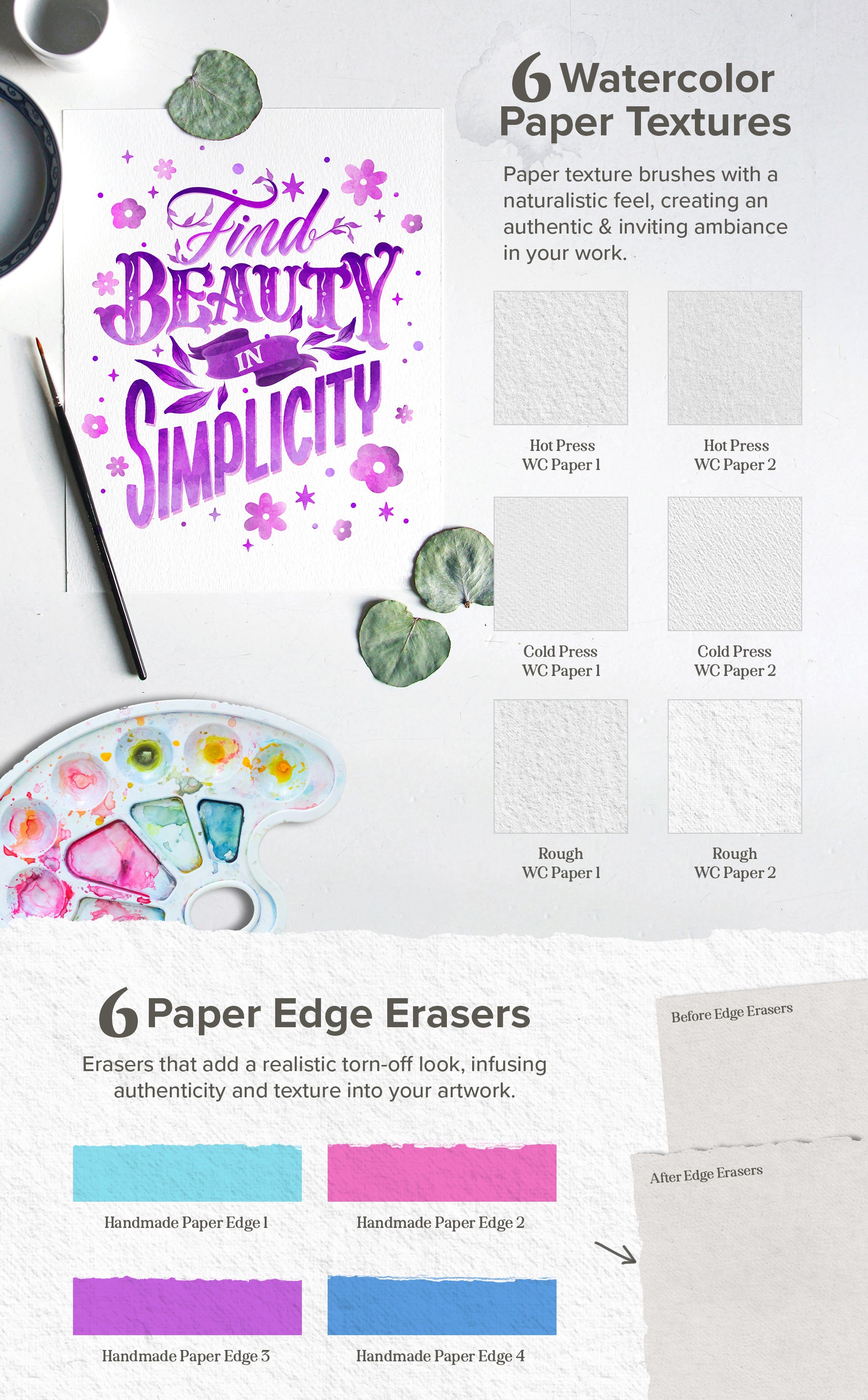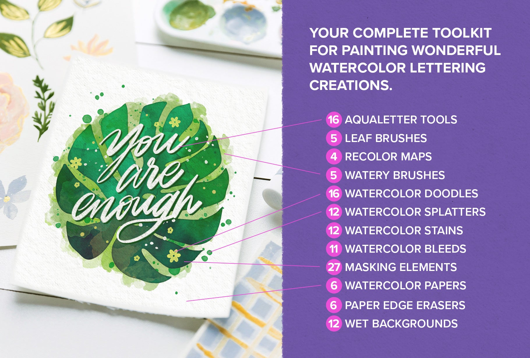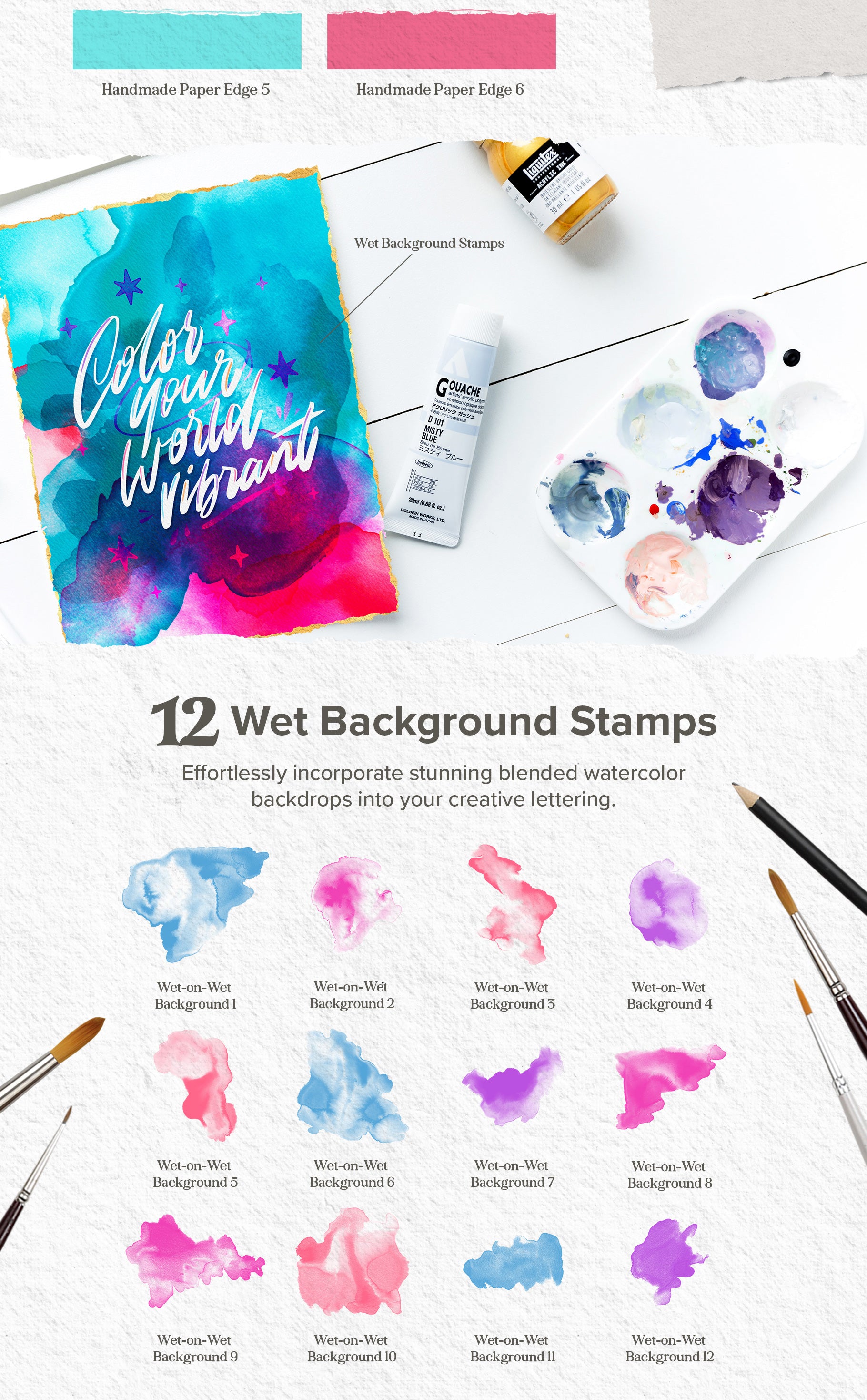 Within this incredible collection, discover a wealth of tools and elements to experiment with. From a versatile array of lettering brushes to whimsical watercolor doodle stamps, enchanting watercolor effects, seamless paint blenders, expressive stains and splatters, versatile masking silhouettes, and torn paper edges to authentic paper textures crafted from real papers. This comprehensive set enables you to craft stunning watercolor lettering art that's adored by all.