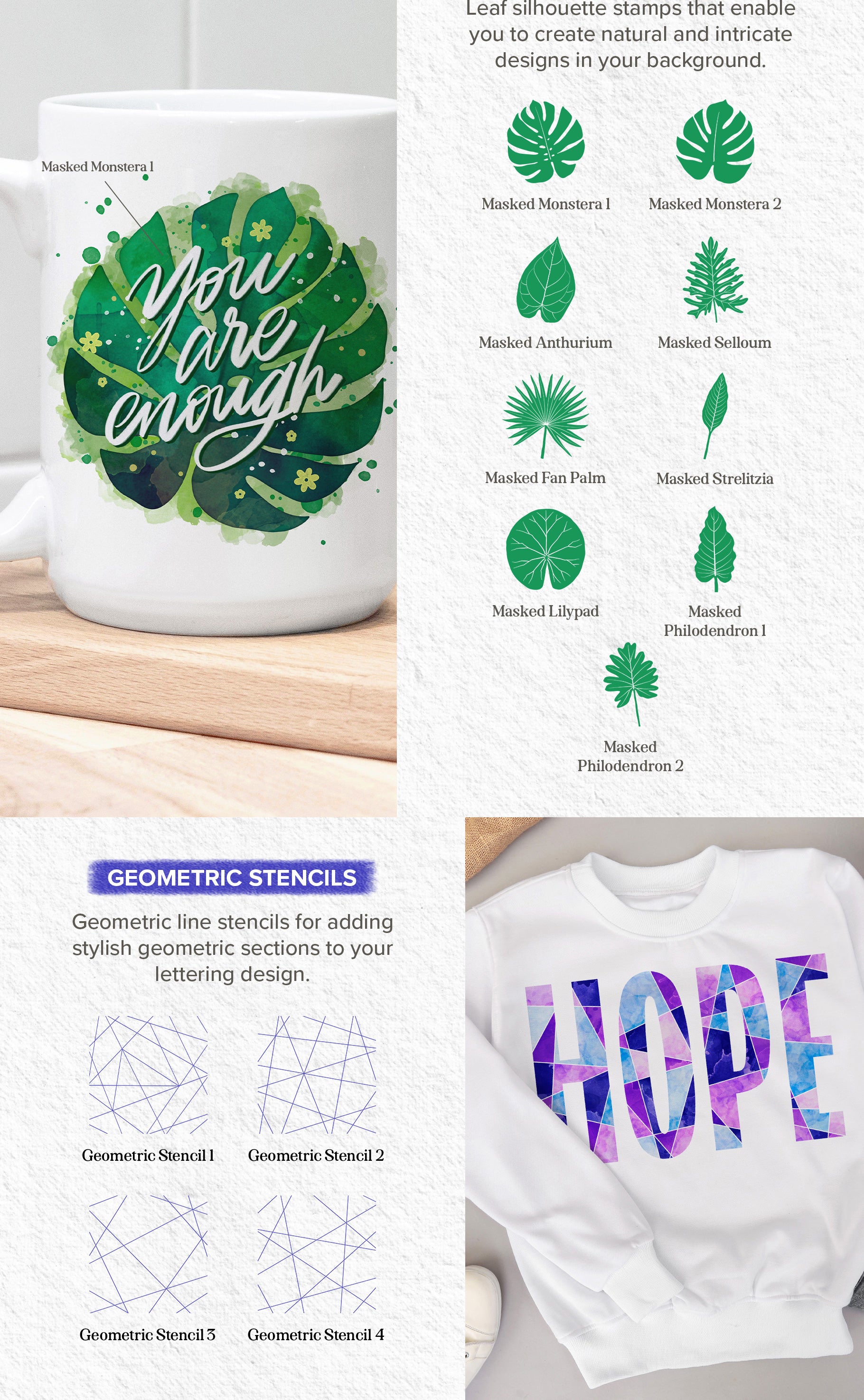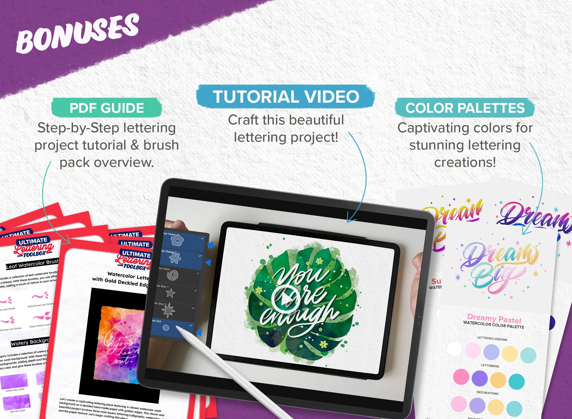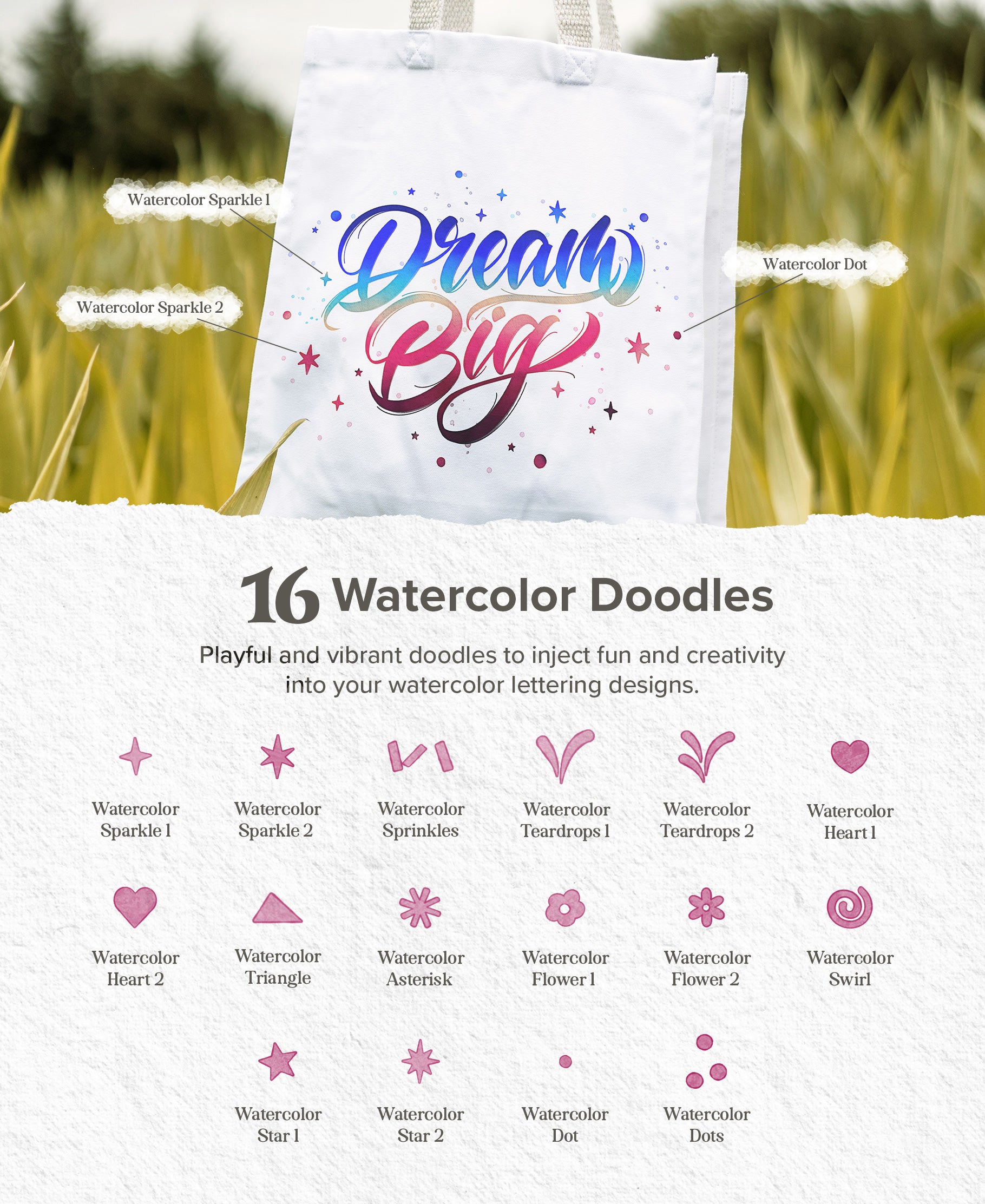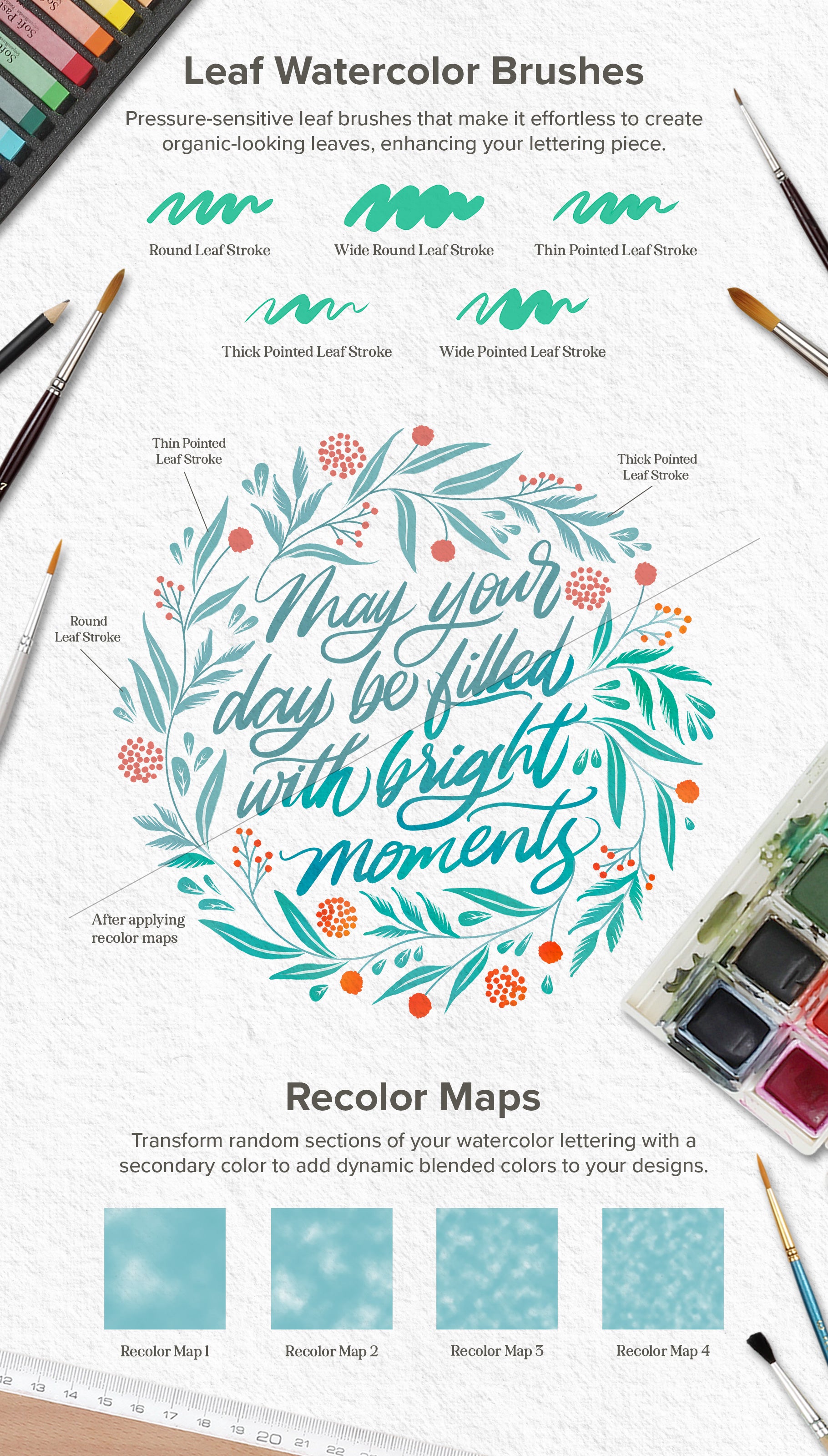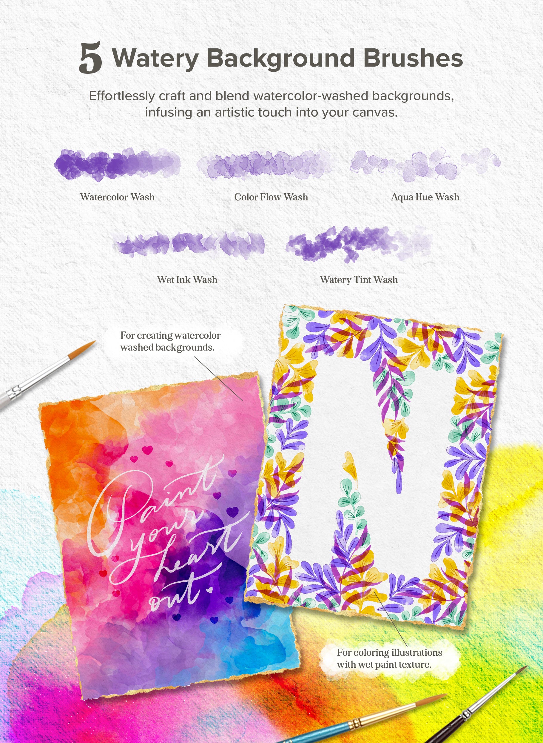 Within this incredible collection, discover a wealth of tools and elements to experiment with. From a versatile array of lettering brushes to whimsical watercolor doodle stamps, enchanting watercolor effects, seamless paint blenders, expressive stains and splatters, versatile masking silhouettes, and torn paper edges to authentic paper textures crafted from real papers. This comprehensive set enables you to craft stunning watercolor lettering art that's adored by all.