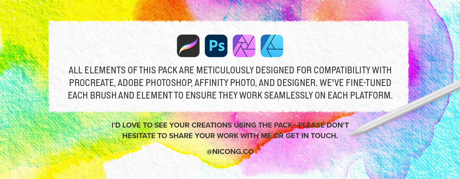 Whether you work with Procreate, Photoshop, Affinity Photo, or Designer, this pack is meticulously designed to enhance your creative process and help you achieve the magic of lifelike watercolor artistry.